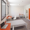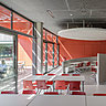 L’atmosphère de chaque espace a été pensée selon sa fonction, avec un soin et une originalité particulière. Dans le restaurant, une cloison-banquette courbe déploie ses lignes sinueuses pour créer une séparation entre le self et la salle, tandis que de petits îlots ovoïdes créent des zones d’intimité très appréciées des élèves. De même, dans le CDI, les meubles porte-revues et les tables support d’écrans ont été spécialement dessinés par l’agence. Quant au confort thermique de ce bâtiment basse consommation, il est assuré par une isolation extérieure renforcée, une ventilation en double flux et des protections solaires extérieures.