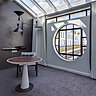 Dans les suites hublots, une petite partie vitrée offre encore un peu plus de lumière. La salle de bain dispose d’une plus petite baie vitrée en forme de hublot qui donne sur la chambre. La seule touche de couleur est ce fauteuil aux arrondis recouverts d’un tissu jaune moutarde légèrement acidulé, des meubles aux formes arrondies réalisés avec des matériaux neutres et contemporains, un style simple, mais très efficace souvent utilisé par Jean-Philippe Nuel.