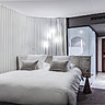 Dans toutes les chambres, un style épuré : couleurs neutres, blanc, gris taupe clair, plafond foncé pour donner du volume, ou avec des impressions en noir et blanc dans les suites. Des têtes de lit aux oreilles matelassées et recourbées accueillent des interrupteurs et prises électriques. Des rideaux transparents à grande ampleur, d’un gris légèrement plus foncé, longent la fenêtre et le mur mitoyen, et occultent la lumière avec leur sous-couche blanc cassé.