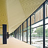 Sur la droite, un restaurant ouvert sur une terrasse avec au-dessus l’aile Sud des bureaux. La façade principale est revêtue de lattes de bois qui protègent des radiations solaires. Sur la gauche, le Grand Café avec l’aile Nord des bureaux qui se caractérise par sa légèreté et ses matières brillantes (acier inoxydable, aluminium, béton et verre peint). Les nouvelles unités et les bâtiments sont reliés par la Rambla. Orientée plein Sud, une baie vitrée permet à la lumière d’inonder l’espace via des verres aux tons chauds. Au Nord, les espaces varient progressivement, allant de la transparence, à la lumière des espaces clos plus sombres, à l’intersection avec le bâtiment existant. Au-delà de la première aile, le patio du bâtiment flotte au-dessus du jardin du cloître déjà existant. En plus de la Rambla, des passerelles en verre favorisent le rapprochement avec les jardins un peu plus loin.