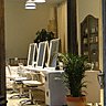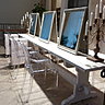 Pour créer un univers inédit, loin des salons de coiffure traditionnels, il était nécessaire d'utiliser d'autres pistes que les agencements professionnels. La plupart des meubles du salon ont été chinés, rénovés ou vieillis selon les besoins. Pour exemple, la table de coiffage centrale est une table de monastère aux dimensions introuvables qui a été chinée sur Internet et livrée de nuit depuis le sud de la France! Même histoire pour le bureau à l'accueil. Ils ont ensuite été poncés, peints et vernis par votre serviteur ! La table d'attente a été « vieillie » à la ponceuse pour l'harmoniser à l'ensemble.