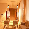 La décoration de ce salon avait une priorité absolue : son aspect chaleureux, en clin d'oeil aux origines latines des propriéraires. Tout est harmonie de bois blond patiné, de lin naturel et de douces patines. Les camaïeux de blanc cassé, taupe et bruns apportent toutes leurs douceurs. Les fauteuils capitonnés à l'entrée donnent tout de suite une impression de petit salon boudoir ultra cosy. A part le mobilier technique incontournable comme certains fauteuils, tout a été choisi comme pour meubler un appartement classique. La plupart des accessoires échelles étagères, petits miroirs, photophores...ont été sélectionnés dans une grande enseigne de mobilier.