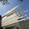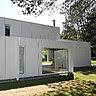 L’extension se compose de plusieurs volumes qui développent des espaces et des matériaux de qualité en harmonie avec les magnifiques arbres existants, préservés et mises en scène. Son vocabulaire est caractéristique et développe un ensemble de part d’autre du bâtiment existant, tel un écrin blanc qui s’étire. Les traitements extérieurs paysagers sont ainsi des espaces tampons entre ces éléments fondamentaux du projet. Côté matériaux, la structure de l’extension est réalisée en ossature bois doté d’un parement en panneaux composite (Equitone Tectiva d’Eternit). L’ensemble des menuiseries extérieures est en aluminium (Technal). Une partie des toitures terrasses est végétalisée. Les ferronneries sont en acier et en aluminium laqué.