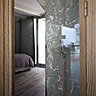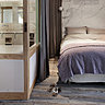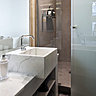 Pour conserver les particularités du lieu neutre, l’architecte a privilégié des matériaux simples, sobres et mats. Inox en cuisine, béton blanc, au sol, qui ramène la lumière au centre de l’appartement. Dans la chambre, on a choisi un parquet en mélèze. Le marbre apporte une touche de luxe et son veinage converse avec celui du bois. Le poteau en béton existant a été laissé brut. Et on aime ce mélange de raffinement et de naturel.
