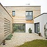 Situé sur une zone pavillonnaire limitrophe de la ville de Châteauroux, ce projet de construction ne profitait pas d’un emplacement de choix. A proximité d’une route, il s’agissait de bâtir une maison d’environ 300 m² sur un terrain étroit, une bande constructible de 40 mètres de long. « Pour réaliser un volume classique, il aurait fallu un terrain deux fois plus grand », raconte l’architecte DPLG Emmanuel Alassoeur. Le terrain a permis un déploiement particulier de l’espace, avec une façade orientée plein sud, et une vue arrière sur la forêt côté nord. Soleil du matin, à l’est ou soleil du soir, la maison remplit parfaitement l’espace du terrain. « Les propriétaires souhaitaient un toit terrasse qui n’a pas posé problème. Par contre, l’habillage en tôle, proposé initialement, n’a pas été accepté au niveau du permis de construire. J’ai donc proposé un bardage en red cedar qui offre une jolie patine grise au fil du temps ».