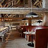 On entre dans la brasserie, la Grande Ecurie Royale, bâtiment classé à l’extérieur et à l’intérieur. Un volume de 800 m² et de 13,50 m sous charpente ! On découvre d’un seul coup d’œil l’escalier, impressionnant ouvrage qui incarne l’idée du bâtiment mis à nu, enroulé comme une spirale. Il fallait rendre convivial ce gigantesque espace. Ne pouvant pas le cloisonner, la cuisine a été créée comme un élément indépendant, ouvert sur la salle. Au pied de l’escalier, l’espace lounge, puis, à l’étage l’agence Jouin Manku a imaginé une yourte recouverte de cuir piqué façon sellier, de 30 m², et de 5 mètres de haut pour rendre intime cet immense architecture, et dissimuler les parties techniques. Les matériaux bruts et naturels sont déclinés dans le restaurant: inox, zinc noir ou acier patiné, chêne brut et cuir.