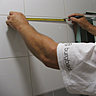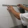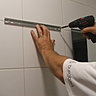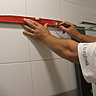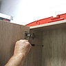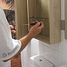 4ème phase : livraison d’un meuble pré-monté d’usine. L’installation du meuble se fait sur une surface saine à l’emplacement souhaité et si besoin, raccord à la plomberie par un artisan. Dans le cas d’un meuble haut, après avoir pris les mesures, l’artisan trace les repères à l’aide d’un niveau afin de mettre à niveau le rail de fixation du meuble haut et vérifie le positionnement définitif des fixations du rail. Il perce ensuite les trous à l’aide d’une perceuse ainsi que d’un foret adapté, pour placer les chevilles adaptées au mur, puis fixe le rail dans les chevilles. Le meuble et les façades étant préparés par l’usine pour être accroché au mur, il n’y a qu’à le raccorder au rail fixé et régler les fixations et la mise à niveau à l’aide d’un tournevis. Une fois le meuble serré en ajustant la vis du haut, l’artisan pose les caches-vis et fixe la poignée.