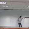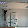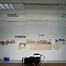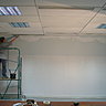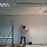 Le mur doit être assez lisse. Si besoin boucher les imperfections avec un enduit de rebouchage exemple « Toupret ». Puis après séchage, poncer légèrement avec un papier de verre à grains moyens 100, afin d’égaliser le support. Appliquer ensuite deux couches de peinture acrylique (à l’eau), aspect satiné blanc. Prévoir un temps de séchage entre deux couches de plus ou moins 6 heures. Dans l’exemple : le mur était déjà préparé avec deux couches d’acrylique bleu satiné.