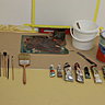 Couleurs à l’huile utilisées (tubes à l’huile pour artistes) : ocre jaune, terre de Sienne naturelle, ocre rouge, brun Van Dyck, terre d’ombre brûlée, bleu de Prusse, chrome orangé, blanc de zinc ou blanc de titane.