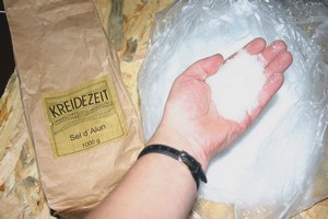 - un fixateur des pigments : le sel d'alun (chez les fournisseurs de produits naturels). Il contribue à la tenue de la teinte. Son aspect est très proche de celui du gros sel.