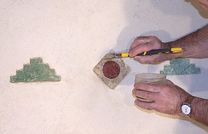 Le motif des pyramides aztèques, assez simple à réaliser et idéal pour un débutant, a été dessiné puis découpé dans un morceau de carton qui va servir de gabarit. Il aurait pu tout aussi bien être décalqué sur un poncif puis reporté sur le mur avec une poupée (voir la fiche; créer une mosaïque ) ou simplement dessiné à main levée. Placez-le aux endroits prévus. Tracez les bordures du dessin au couteau de peintre ou au cutter, en tenant la tranche de préférence à 45°. Enfoncez la lame sur l'épaisseur de l'enduit de finition. |