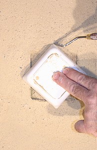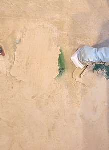 En tenant le couteau de peintre à environ 45°pour ne pas agresser le fond, grattez l'enduit de finition jusqu'à retrouver le corps d'enduit teinté. Essuyez ensuite minutieusement, sans toucher les bords, avec un chiffon propre légèrement humidifié. Laissez sécher tout l'enduit le temps nécessaire, soit 15 jours à trois semaines. |