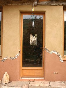 Autre idée, des coquillages et des galets incrustés dans un corps d'enduiten terre, viennent délimiter l'emplacement d'un soubassement coloré et mettent en valeur l'entrée de la maison (Réalisation Vishwan terre ). L'enduit de finition les affleure sans les recouvrir et sans créer de joints, ce qui donne la sensation de profondeur. Ils peuvent alors être laissés tels quels ou vernis. En voici le détail : ![]() |