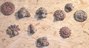 Les incrustations choisies sur notre exemple proviennent du Mexique: ce sont des motifs artisanaux de Dieux Aztèques en terre cuite pigmentée.