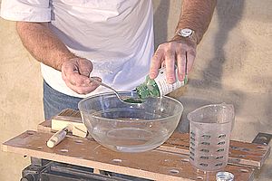 Préparez une eau pigmentée de type "fresque", c'est à dire simplement de l'eau mélangée à du pigment, pour l'appliquer sur le corps d'enduit frais.Une à deux cueillères à soupe de pigment dans 1/2 litre d'eau suffisent. |