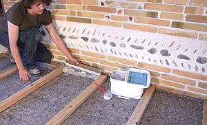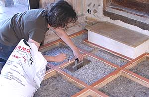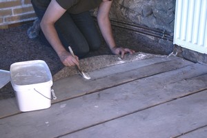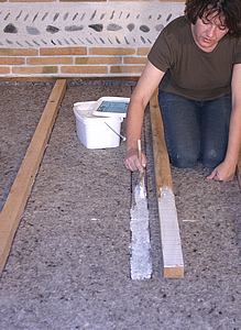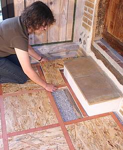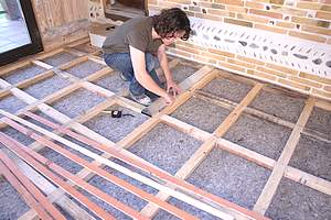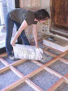Commencez par dépoussiérer, laver et traiter le plancher existant. Aérez jusqu'à son séchage complet .Les bandes de feutre (0,5 x 100 cm) de laine de mouton (Feutral) le recouvrent et contribuent à l'isolation phonique et thermique du lieu tout en comblant et égalisant les interstices et écarts de niveaux entre les planches. Lors de sa mise en place, tenter d'étirer la laine assez élastique risque de déchirer les fibres et par là même de perdre en qualité d'isolation. Etalez donc en souplesse. Posez-le en débordant de 4 cm sur les murs et encollez au spalter les planches recevant les bords du feutre . |