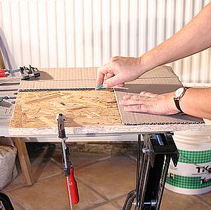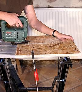 ![]() Placez le gabarit sur l'envers de la dalle. Montez une lame très fine (à métaux), sur la scie sauteuse et découpez très précisément. |