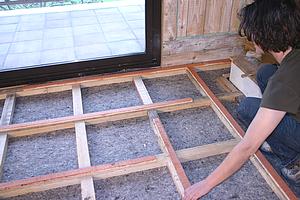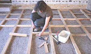 La pièce concernée est à l'étage. Le plancher existant, épais de 3 cm, est composé de vieilles planches de sapin en bon état mais sans bouvetage, clouées sur des solives.