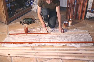 ![]() Peignez la plinthe (7x10 cm) de 3 couches d'huile dure la même couleur que les liteaux et fixez-la à plat le long des murs, bord arrondi vers la pièce, pour créer un cadre assez large très esthétique. |