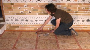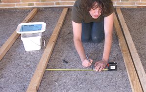 Placez la première lambourde (60 x 40 mm) sur sa face de 60 mm au milieu de la pièce