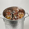 Pour procéder au traitement thermique, les bocaux doivent être placés dans le stérilisateur ou l’autocuiseur sans contact direct avec la source de chaleur. Dans le cas de l’autocuiseur, enveloppez le bocal dans un chiffon épais pour éviter tout choc entre eux. Le stérilisateur a l’avantage d’être muni d’un système de colonnes servant à les maintenir et les bloquer par le moyen de ressorts ou de crochets. Pour ne pas créer de choc thermique, l’eau versée sur les bocaux ne doit pas être bouillante. Vous pouvez rajouter du sel pour permettre un temps de chauffe plus rapide, à raison de 2 cuillères à soupe de sel pour un litre d’eau. Le niveau de l’eau ne doit pas dépasser les 4 cm du bord de la cuve, mais veillez à ce que les bocaux soient totalement immergés. L’eau est portée à ébullition et doit être maintenue le temps nécessaire selon les aliments. Dans le cas de l’autocuiseur, il faut attendre que la soupape laisse s’échapper la vapeur pour commencer à décompter le temps de stérilisation. Le stérilisateur a l’avantage de posséder un thermostat et un chronomètre qui assura de meilleures conditions.