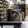 Dans cet atelier règne une atmosphère au décor authentique et brut qui peut surprendre. La plupart du mobilier a été chinée et adaptée à l’espace ; les lourdes portes d’acier aux poignées de laiton proviennent de la Banque de France, les majestueuses grilles de fer de la cour et de la boutique ont été récupérées dans une orangeraie, les lampions à suspension viennent d’un bateau militaire des années 30.