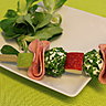 Piquez sur des pic à brochettes, un cube de pomme verte, un morceau de jambon plié, une bille de fromage de chèvre, un cube de pomme rouge, une seconde bille de fromage de chèvre, un autre morceau de jambon, et terminez par un cube de pomme Golden.