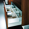 Nous avons tous pris l’habitude d’une porte de garage électrique, d’un portail qui réagit avec une télécommande et même d’une poubelle qui s’ouvre béante dès qu’on passe la main devant. Alors pourquoi pas ses tiroirs de cuisine ? En effet, lorsqu’ils sont chargés de piles d’assiettes, ils peuvent être relativement lourds à manœuvrer. Et lorsqu’on s’approche les bras chargés ou les mains chocolatées, une simple impulsion du genou sur la face avant du tiroir et celui-ci s’ouvre miraculeusement.