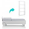 La transformation du lit s'effectue également en quelques étapes simples : retirez le matelas, le sommier, les roulettes et les protections latérales, pivotez la structure à la verticale, installez les étagères fournies
