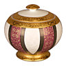 Blancheur de givre de cette porcelaine, réminiscence de la lumière nacrée qui baigne les vastes plaines enneigées de Russie, que ceinturent d’éclatantes arabesques. Opulence et richesse de l’incrustation or et des teintes pourpres et vert bronze sublimées par la profusion de détails dans le décor, qui nous transportent sur les rives de la Volga.
