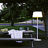 2. Salon au jardin : Grande Costanza Open Air de Luceplan est un lampadaire en acier vernis (coloris aluminium, blanc ou rouille) équipé d’un abat-jour en polycarbonate (blanc, ivoire, rouille ou vert). Halogène ou fluo basse consommation. 1 171 euros.