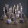 On peut jouer l’effet dépareillé de modèles différents avec quelques règles de base. En camaïeu ou dégradé, l’effet de masse de plusieurs bougeoirs regroupés par le dénominateur commun de la couleur créé un impact visuel intéressant. En version bicolore contrastée, deux bougeoirs (par exemple noir et blanc) peuvent s’accorder aux tons dominants de la décoration de la pièce. Les matériaux neutres et naturels s’accordent plutôt avec une ambiance chic voir classique, raffinée, des tons de beiges, de marrons ou de gris.