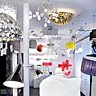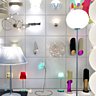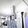 Le rez-de-chaussée tout d’abord, habillé de murs blancs et ponctué d’éléments graphiques noirs au sol, est consacré à des pièces très contemporaines. Lampadaires, lustres ou encore appliques, on y retrouve des marques incontournables, telles que Artemide, Flos, Luceplan mais aussi d’autres créations plus confidentielles et en exclusivité comme "Brand van Egmond", "Deux Ailes" ou "Coup de Foudre". Les luminaires sont disposés sur des cubes modulables en médium laqué blanc.