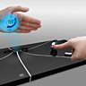 Trois « osselets » différents, d’aspect chromé, incarnent chacun une ergonomie et donc une action : la variation, la coupure, la sélection. Chaque osselet se pose sur l’un des champs du plateau : en le manipulant d’un doigt, intuitivement, il agit sur l’application choisie et offre un retour d’information projeté directement sur la main par un faisceau lumineux.
