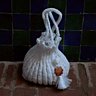 Le très élégant sac Nini à finition de gland en mika tricoté en côtes est en sabra 100% végétal de fibres d’aloès. Ce fil mélangé à d’autres fibres sert habituellement à la fabrication de passementeries et décors de djellabah. Domino achète le sabra déjà teint mais sans mélange, elle le mouline pour le rendre mat et plus facile à tricoter et à crocheter.