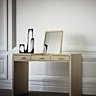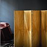 Le fameux point « piqué-sellier » a été adapté aux créations dépouillées mais ultra-sophistiquées du décorateur. Les riches matériaux que sont le parchemin, la marqueterie de paille, le galuchat subliment le dépouillement des formes des meubles raffinés tels que le paravent à quatre volets, les tables gigognes en forme de U inversé ou encore la coiffeuse à trois tiroirs. Les cuirs d’exception sélectionnés avec les tanneurs habillent le canapé deux places gainé de veau aux pieds en chêne massif naturel ou les chaises avec assise rembourrée.