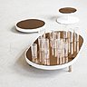 Le travail de Grint, duo de designers, repose sur la conception de pièces uniques pour les intérieurs. Pour la nouvelle collection Serax 2016, Michiel Goethals et Mattias Van Mieghem se sont inspirés d’un environnement. Le résultat ? Une collection de plateaux imprimés en sérigraphie, avec des motifs en chevrons ou point de Hongrie, oscillant entre marqueterie façon ébéniste et parquet classique. En finition, les poignées sont en laiton aluminium et acier laqué, apportant une touche raffinée.