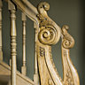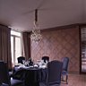 Entièrement lambrissée de chêne grisé, dessiné par Léopold Goor, qui a su s’inspirer des parquets « Versailles », la salle à manger offre un espace intime et chaleureux, accentué par les lourdes tentures de lin bordées de passementerie Declercq. Derrière tout ce travail de panneautage se dissimulent de grands placards pour conserver toute la vaisselle et le linge de maison. Un lustre ancien de Baccarat a été chiné par Laurence chez Louis Pierre Denil. La table juponnée de taffetas et de lin noir est entourée de chaises classiques revisitées habillées de lin noir Styldécor pour LP Décoration, le couvert dressé est un mélange de porcelaine fin XVIIIe et de céramique contemporaine Rina Menardi, couverts Roux Marquiand.