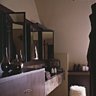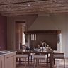 Concernant la cuisine, dans l’esprit de conserver les matériaux d’origine, les pavés encadrés de lattes de chêne ont été restaurés. Le plafond lui a été décaissé afin de faire apparaître les « voussettes de brique » élément classique dans les constructions anciennes belges. Tandis que les stores en lin prune atténuent la lumière du Nord, La table entourée de chaises et tabourets recouverts de cuir clair, crées par LP Décoration et réalisés sur mesure par Debuysser, se prépare pour la collation du soir. Coupe noire les Héritiers, couverts Sabre.