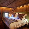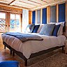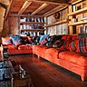 Sur 450 m², il développe un style qui mêle tradition alpine sans folklore, et modernité tout confort. Ses 6 chambres de 25 à 70 m² peuvent accueillir 13 personnes. La literie et le linge de lit sont signés Yves Delorme, les rideaux Lelièvre, les coussins et têtes de lit, Tissage de Nantes, Steiner et Linvosges. Bois patiné, tons fauves et caramels, il est décoré avec des objets d’antiquités chinés dans les brocantes ou retrouvés sur les lieux, comme un étonnant poêle en faïence colorée autrichien.
