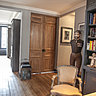 L’entreprise Huggy s’est chargée de la réfection des peintures, de l’électricité et du chauffage. Des radiateurs en fonte vintage ont été installés, pour s’accorder avec le style de la nouvelle décoration. Huggy a aussi assuré des travaux de menuiserie et la création de rangement sur mesure. Elle a mis en valeur le parquet d’origine en le ponçant et en le recouvrant d’un vernis mat, pour retrouver son lustre d’antan. Les portes anciennes d’origine ont été poncées, pour offrir l’aspect naturel du bois. Et sur la toile de fond d’une peinture grise mate (gamme Farrow and Ball), tous les objets et meubles chinés par la propriétaire, au talent digne d’une professionnelle, ont pris tout leurs sens et leur ampleur.