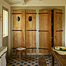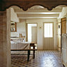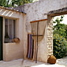 La grande cuisine-salle à manger, dotée d’un carrelage ancien à cabochons récupéré dans un château de la région d’Ambroise, est la pièce centrale de la maison. La crédence, en béton teinté et vieilli, court le long du mur. En dessous, les petits rideaux de lin brut masquent appareils et machines ainsi que le four et complètent l’esprit monacal du lieu. Sur la grande table de ferme entourée de bancs, le couvert est mis pour un petit dîner intime. Au fond de grands placards ont été créés et s’ouvrent à l’aide de portes anciennes chinées chez un récupérateur de matériaux de l’île.