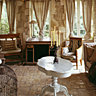 La partie la plus ancienne de la petite maison est encaissée et l’on descend dans le salon par trois marches, la pierre blonde des murs et les pavés inégaux du sol confèrent à l’ensemble une ambiance très douce et reposante, ponctuée çà et là par les grands rideaux de lin noués par de gros nœuds. Au centre le guéridon gondole a été patiné par Dominique et fait office de table basse. Sur la cheminée en pierre Charentaise, repose un trumeau patiné à l’ancienne, l’hiver toute la famille se retrouve devant l’âtre où l’on fait de grandes flambées. Une partie des murs est doublée comme le plafond en planches brutes badigeonnées.