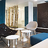 Les effets de contrastes et les jeux de détournements participent à la modernité du lieu : rideaux en drap de laine empruntés à la mode masculine, courtepointe en maille de cachemire artisanale (Lelièvre), coussins aux broderies graphiques, tentures de velours chatoyant (Elitis), lampadaire en cocons de soie (Ango Design) ou feuille de cuir en guise de bureau… L’ensemble du projet oscille entre féminin et masculin, sans fausse note. Les deux architectes n’ont pas hésité à oser les matériaux bruts ; elles ont fait entrer un peu de nature dans l’hôtel, en créant une séparation avec des troncs de bouleaux entre le lobby et la réception.