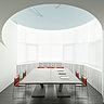 Des tentures textiles sont installées devant chaque fenêtre et servent de séparateur d’espace dans le salon pour cacher un home cinéma. Quant à la salle à manger, elle a été installée sous une rotonde entièrement redessinée qui fait penser à la salle à manger de l’Elysée conçue par Pierre Paulin sous la présidence de Georges Pompidou. Véritable cocon, cet espace est mis en valeur par la lumière. Tandis que mobilier design minimaliste, d’origine japonaise ou italienne, joue les sculptures contemporaines.