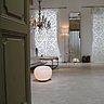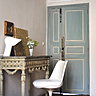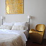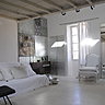A l’intérieur, les murs ont été peints en blanc pour conquérir la lumière. Tons beige, blanc cassé ou gris perle s’y associent en touches légères. Les toiles du peintre les ponctuent de leurs couleurs et motifs travaillés comme des fresques anciennes, où se mêlent teintes usées et patinées et feuilles de métaux aux reflets irisés. « Comme dans ma peinture, à l’intérieur de la maison, les époques se télescopent. Une lampe design années 1970 voisine avec une gravure ancienne. Une chaise en plastique transparent cohabite avec un miroir vénitien». Et une banquette XVIIIème se laisse dévergonder par des coussins ébouriffés.