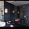 Chaque salle de bains, bien que différentes les unes des autres, utilise les mêmes matériaux et couleurs : ardoise noir, murs blancs et chrome.