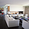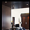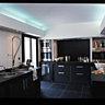Dans un souci de confort, les sols des chambres sont en moquette tendue sur thibaude. Certains éclairages indirects sont traités par des coffres lumineux qui renvoient la lumière au plafond et donnent plus d’ampleur à la hauteur de la pièce. Dans le salon et dans la salle à manger, les bandeaux lumineux se raccordent à la hotte de la cheminée de façon très cubique. Aériens, ils sont décollés des murs de façade ce qui leur permet de mieux diffuser la lumière.