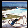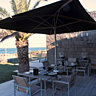 Des gravillons blancs s’étalent devant la piscine et forment une grande place parfaitement minérale propice au repos. Sur les terrasses, le grand parasol noir répond au sol en mélèze blanchi donnant un aspect de bois lavé. Le mobilier extérieur en osier clair ou en teck adoucit la dualité du noir et du blanc, complété par l’inox qui s’affiche dans toutes les structures du mobilier.