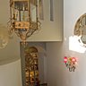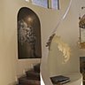 L’entrée de La maison se fait par le côté et donne sur le grand escalier monumental que Rosarinho a totalement relooké en lui imbriquant une niche dans laquelle elle a placé un grand candélabre et dont le fond est appliqué d’un grand pochoir baroque. Une grand feuille d’acanthe est également peinte sur la rampe de l’escalier répondant à la lanterne ancienne qui éclaire les degrés.